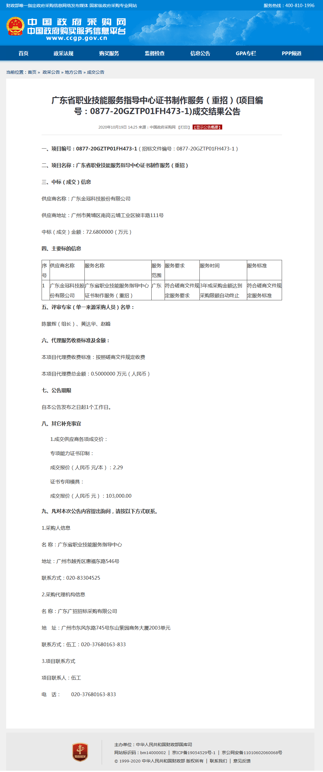 广东省职业技能服务指导中心证书制作服务(重招)(项目编号:0877-20GZTP01FH473-1)成交结果公告